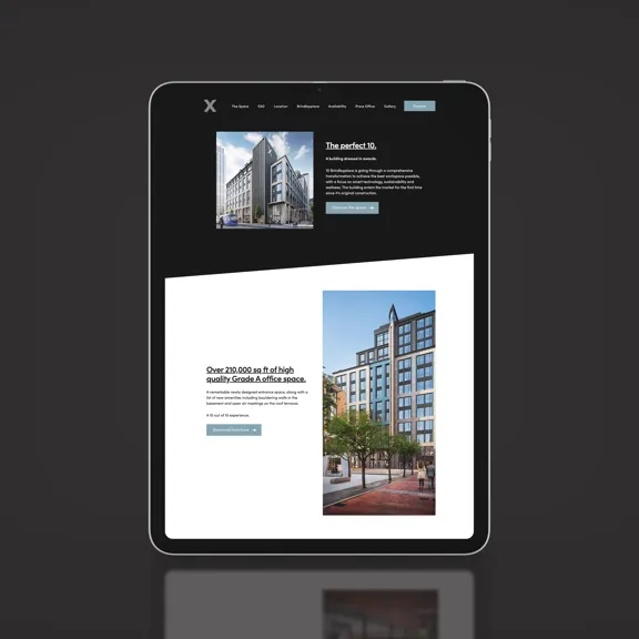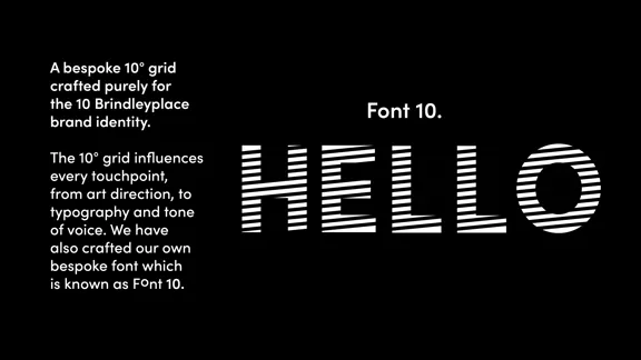 We centred our big idea around ‘The perfect 10’. A building that is perfect on every level. 10 out of 10. A building to strive for and has a new reputation of being the best. We proposed the key visual element to be based around an angled ‘fraction’ line - set at 10 degrees. This was the foundation of the identity, all visual language and communications and inspired the environmental styling including the way finding signage.
